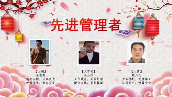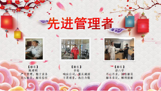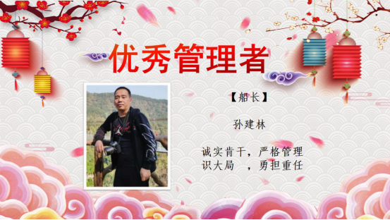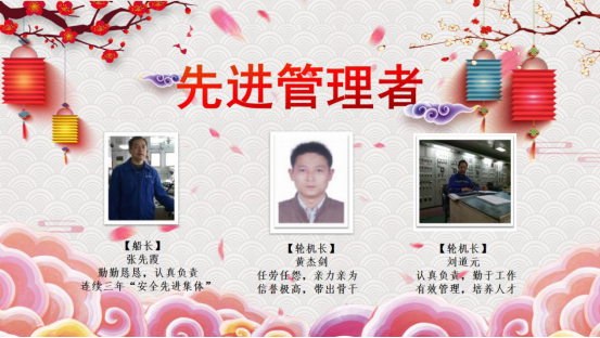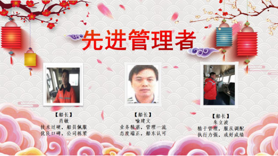 2004到2019,十五年來興盛洋公司不斷地發(fā)展壯大,公司的每一次進(jìn)步都離不開所有人的努力。在新春佳節(jié)到來的時(shí)刻,也同樣是豐收的時(shí)刻,經(jīng)船員主管的推薦和公司的評(píng)選,本年度優(yōu)秀管理者、先進(jìn)管理者以及優(yōu)秀船員名單已產(chǎn)生。