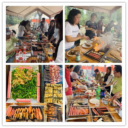 不用等到夜幕降臨,不用去到市井里弄,在這景色宜人的方寸間,大家圍在燒烤架邊,幾位同事展示了不同的燒烤方法和技藝,邊聊邊生疏或嫻熟的翻烤著,忙的不亦樂乎!。燒得通紅的炭火把燒烤網(wǎng)上的肉肉炙烤地滋滋作響時,雞翅慢慢變成金黃色時......我們七葷八素的口腹之欲在這一刻都得到了滿足。歡聲笑語隨著縷縷炊煙縈繞在空中,大家吃著自己親手烤出的各種食品,聊著自己在工作和生活中遇到的各種趣事,其樂融融!
